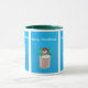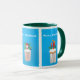 A festive white ringer mug with holly green rim and handle and 'Merry Christmas' in white letters on three bright blue panels, containing cupcakes. The cupcakes have white frosting and are topped with a snowman, a robin and three red candles.