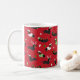 Christmas Dachshunds Mug, Cute Dachshund Dogs in Festive Holiday Outfits with a Red Background.