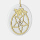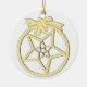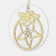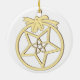 Christmas decoration in ceramic hanging, triple star in a ball decorated with ribbons and sheets of coal. White background, possibility of coloring the background