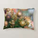 Christmas pillow with images of Christmas tree and ornaments.