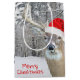 Big buck deer with Santa Claus hat in winter forest with snowflakes.