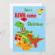 A fun Dinosaur Flat Christmas card for the xmas holiday season with a cartoon baby T Rex holding a wrapped gift / present and a triceratops with xmas string lights with a blue sky background with falling snow flakes and a fun quote - Have a RAWR-some christmas. The fun snow cap text can be amended to customise the card to suit your needs. A sweet and cute design for little boys and girls who love Dinosaurs to send to family and classroom friends for the holiday season, or for a teacher to hand out to the class students.
