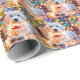 Cute white dog in tangled holiday lights on multi-coloured background.