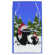Cut holiday design with two dogs in a snow covered forest. Big dog and baby dog each wearing a Santa hat with paw prints through the snow.