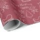 This holiday wrapping paper features a simplistic Christmas theme over a dark red background. Stencil drawing doodle images with cute little elves, a Christmas tree, Santa's sleigh, and snowflakes are tiled across the wrapping paper. A Merry Christmas greeting is printed above the doodles in an elegant script font. A sample name is printed below which you can personalise to include your own custom name or text.