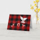 White dove with joy sign on red and white striped string in snowflakes on red and black buffalo plaid for Christmas