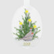 An image of a holiday tree decorated with lit white candles and two doves wearing Santa's hats. Features a place for your own text on the back