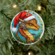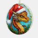 Vibrant and colourful illustration of a dragon wearing a red Santa hat, adorned with white fur. The dragon has golden scales and an intense expression, surrounded by green pine branches and a blue background, giving it a festive and whimsical appearance.