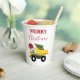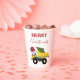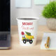 A cute illustration of a Christmas dump truck construction truck vehicle wearing a Santa hat and decorated in Christmas lights with words "Merry Christmas" transporting a festive Christmas tree. Perfect for boys and girls who love construction trucks, toy trucks or heavy machinery. An ideal Christmas paper cup for dump truck enthusiasts big or small, girls or boys.