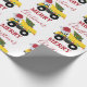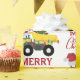 A cute illustration of a Christmas dump truck construction truck vehicle wearing a Santa hat and decorated in Christmas lights with words "Merry Christmas" transporting a festive Christmas tree. Perfect for boys and girls who love construction trucks, toy trucks or heavy machinery. An ideal Christmas wrapping paper for dump truck enthusiasts big or small, girls or boys.
