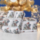 A cute elephant sits wearing a cosy knit hat and striped scarf, surrounded by gift boxes and snowy branches