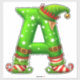 Playful Christmas elf shaped like the letter A wearing a green hat, red boots and mittens; a festive holiday alphabet full of whimsy, stars, jingle bell details and seasonal cheer.