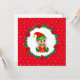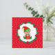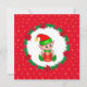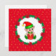 Cute Christmas elf, pine wreath decorated with poinsettias and red Christmas balls surrounded with golden stars on red background Christmas Greeting Card. Text ready to be personalised.