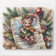 A whimsical elf with delicate wings plays a violin while sitting on sheets of music surrounded by Christmas decorations