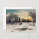 A Winter scene captures a tranquil landscape with a horse-drawn sleigh gliding through a snow-covered village road lined with bare trees. In the background, a church stands under a crescent moon in a vibrant sunset sky.