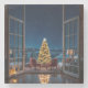 A beautifully decorated Christmas tree stands proudly before open French doors, revealing a breathtaking view of a snow-dusted landscape under a starlit night sky. Two cosy armchairs flank the tree, inviting quiet contemplation and festive cheer. The warm glow of the Christmas lights and a flickering candle create an atmosphere of peace and tranquillity.