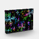 Christmas falling various neon colours snowflakes SlipperyJoe artistic gay pride gifts LGBTQIA dark background vibrant winter vibrant colourful digital illustration blue green pink yellow multicolored bokeh lights festive lively atmosphere depth dimension hanging thin lines black background
