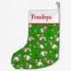 Cute Christmas ferrets in Santa hats with candy canes and string lights on a green background with scattered ornaments. Custom Christmas stocking with your pets name.