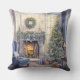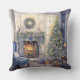 A beautiful warm and cosy blue pillow, of a living room setting with a blue chair, fireplace and Christmas tree