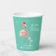 Mid century inspired design featuring a festive pink flamingo wearing a red Santa hat, stars and palm trees decorated with baubles set against an aqua background. A customisable design for you to personalise with your own text, images and ideas. An original digital art image created by Quirky Chic.