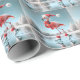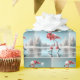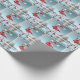 A flamingo wearing a Santa hat and scarf glides gracefully on ice skates across a frozen lake