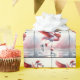 A flamingo with outstretched wings is wearing a Santa hat and red scarf gracefully ice skating.