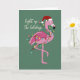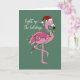 This is a cute Christmas card that has a flamingo in a Santa hat and Christmas lights wrapped around the body. The text says, light up the holidays, and it is all on a green background.
