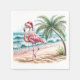 A flamingo wearing a Santa hat strolls along a sandy beach with waves gently crashing nearby