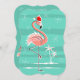 Stylish design with a retro touch featuring a festive pink flamingo wearing a red Santa hat, stars and palm trees decorated with baubles set against a striped aqua background. A customisable design for you to personalise with your own text, images and ideas. An original digital art image created by Quirky Chic.