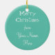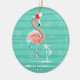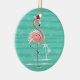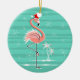 Stylish design with a retro touch featuring a festive pink flamingo wearing a red Santa hat, stars and palm trees decorated with baubles set against a striped aqua background. A customisable design for you to personalise with your own text, images and ideas. An original digital art image created by Quirky Chic.