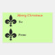 Christmas fleur de lis To From Large Gift Sticker. Two black symbols are on the side of this gift card label, with TO and FROM written next to them. Green background. Merry Christmas is written at the top in red. A unique design for your holiday presents. Size Large: 4.5" x 2.7" PERSONALIZE IT. You can change the wording to Happy Birthday, Cheers, Thinking of You, Birthday Wishes, or a short wording of your choice. To change the font colour to correspond with the occasion or theme, just click on the colour box next to the F Button. To change background colour, use the edit button.