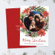 Merry Christmas photo card features an elegant script font with the words 'Merry Christmas' with a festive foliage wreath frame around the photo. Matching red colour on the back of the card with a message in white text. This simple and stylish card is ready for you to customise with your own photo and message. Change the text colour or keep as shown here.