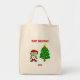 Here you can admire one of Christmas drawings, I call, "Christmas FrankenCheese," FrankenCheese dressed up as Santa, with a decorated Christmas tree, text says, "Merry Christmas." You can now order, "Christmas FrankenCheese," on this grocery tote to wish someone a, Merry Christmas."