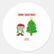 Here you can admire one of Christmas drawings, I call, "Christmas FrankenCheese," FrankenCheese dressed up as Santa, with a decorated Christmas tree, text says, "Merry Christmas." You can now order, "Christmas FrankenCheese," on this round sticker to wish someone a, Merry Christmas."