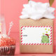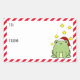 Fun Christmas labels for your presents. A happy green frog wearing a red and white Santa hat and surrounded by bright yellow stars is sitting on the right hand side. On the left are spaces to add the to and from info and a red and white diagonal stripe border.