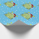 Cute happy green Christmas frog wearing a red and white Santa hat on a blue background with lots of white snowflakes.