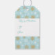 Holiday gift tag is shown with a festive Christmas snowflakes print.