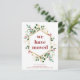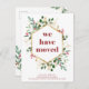 This gorgeous holiday moving announcement features a faux gold geometric frame with matching gold leaves, elegant Christmas greenery, and red holly berries on a modern white background. Trendy, deep red whimsical typography says "We Have Moved." The perfect way to wish your friends a Merry Christmas from your new home!
