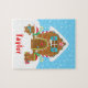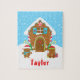 This cute and festive puzzle can be personalised with a name. It features a cute gingerbread house decorated with red and green candy. Beside it are adorable gingerbread men with gifts, dressed in Santa hats and a scarf. In the background is a bright blue winter sky with elegant falling snowflakes. This is perfect for Christmas and the winter holiday.