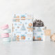 Christmas wrapping paper with a cute gingerbread man, Christmas tree, gifts and snowflakes for babies and little boys with the name and two other different texts, easily personalise them. The light blue background. - Kate Eden Art