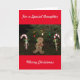 Cute Gingerbread Man Christmas Greeting Card. Personalise outside of card to read Goddaughter, Son, Aunt, Grandparent, etc. Front of Card has a festive Christmas scene with a happy Gingerbread Man holding a wrapped present, Candy Canes and colourful outside holiday trees lights. Inside has special message and pink and blue, and red and white candy canes. Personalise inside of card with YOUR family name. Leave message inside of card, or delete and insert your own, if you wish. Back of Card has smaller artwork of old-fashioned green Christmas tree with yellow star, candy canes, and JOY written on a red tree skirt with holly leaves and red berries and the wording, Peace on Earth. Lovely Christmas Holiday card to send to family and friends. Original Photography, Artwork and Verse Saying by TamiraZDesigns.