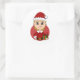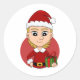 Design with an illustration of a cute smiling happy girl with short blonde hair, she is wearing red and white Santa Claus costume and holding a present; Christmas holidays design with a white background