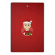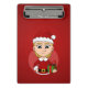 Design with an illustration of a cute smiling happy girl with short blonde hair, she is wearing red and white Santa Claus costume and holding a present; Christmas holidays design with a red background