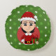 Design with an illustration of a cute smiling happy girl with short black hair, she is wearing red and white Santa Claus costume and holding a present; Christmas holidays design with a seamless green background with stars