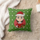 Design with an illustration of a cute smiling happy girl with short black hair, she is wearing red and white Santa Claus costume and holding a present; Christmas holidays design with a seamless green background with stars