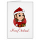 Greeting card with an illustration of a cute smiling girl with long brown wavy hair, the girl is wearing a Santa Clause costume with a red hat and holding a present. On a white background.