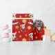 Wrapping paper with an illustration of a cute smiling girl with long brown wavy hair, the girl is wearing a Santa Claus costume with a red hat and holding a present. On a red background.