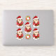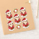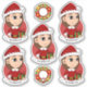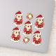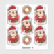 Set of seven cut-vinyl stickers with an illustration of a cute little happy smiling girl with long brown hair, who is dressed in Christmas clothes and is wearing a red Santa Claus hat, on a red background; five stickers of the girl and two stickers with a Christmas wreath; with a customisable text template for your name or message