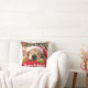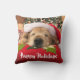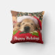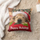 Add a little golden happiness to your home this Christmas! This throw pillow features a photograph of a golden retriever dog who is asleep on a pillow under a tree, and wearing a red Santa hat. Customisable text reads, "Happy Holidays!"