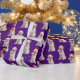 Cute golden retriever with a Santa Claus hat on a purple background and snowflakes.